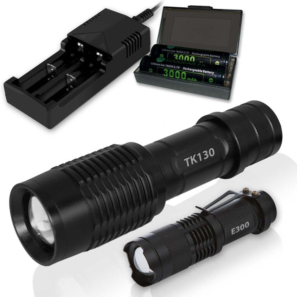 1 x TK130 LED Flashlight 1 x Attached Lanyard 1 x Rapid Battery Charger 1 x AAA Battery Holder 2 x Rechargeable Batteries 1 x Storage Case for Batteries 1 x Mini E300 LED Flashlight (battery not included) 1 x User Manual An excellent flashlight choice for camping, hiking, other outdoor activities, security and disaster prep kits!