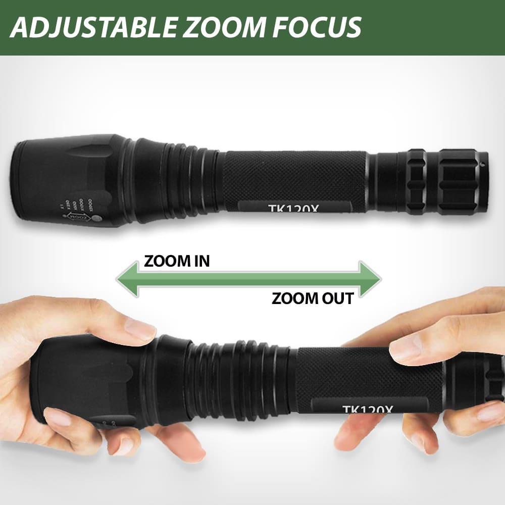 One of the important features of this LED flashlight is the zoom lens. It’s our best 18650 flashlight which is ideal for many situations from hunting and camping to security work. The Adjustable Focus Zoom on the TK120X LED Tactical Flashlight allows you to shine the light beam on a targeted area. It can even be something in the distance. You might need enhanced light on a moonless night to spot a deer or an owl in a tree. Security guards often need to see exactly what something is even in a dark warehouse. It might be a stray animal but it could be a thief. You need to know. 5 Light Modes Five Preset Light Mode OptionsThe TK120X Flashlight offers five different preset light modes (High, Medium, Low, Strobe and SOS). Want to change to a different light mode? It’s easy. Just quickly click on the tail-cap button. This is a must-have for those who like to go for a stroll in the evenings. This professional LED flashlight can be a lifesaver for individual self-defense. Of course, if you just need a simple flashlight on any project, use the medium or low beams. In S.O.S. mode, the flashlight will send out the international Morse code distress signal. When activated, the light beam flashes quickly three times, slowly three times, followed by three more fast flashes. The light flashing frequency is standard and the S.O.S light mode repeats itself when the light cycle completes.